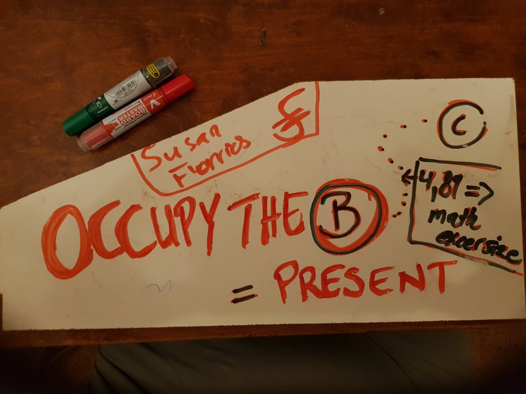 In the sign I created for this purpose, there is a little math exercise. I spelt it wrongly, “excersize” – but in a way it fits, simply since part of the answer has to do with size in a sense. Anyhow, the exercise is a combination of physics, math and mathematical philosophy. It’s marked with a green pen, but related to the red phrase “Occupy the Present”. One point of the exercise has already been defined to 4,89 by one person who I met.