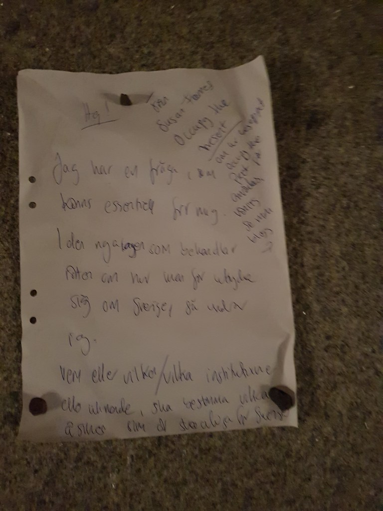 I further went to the parliament building, delivering the letter that you can see below. It is a humorous question, with a serious note, hinting towards a new Swedish law, which prohibits public discussions and whistle blowers from revealing national security issues in a way that might damage Swedish interests, as well as the Swedish image abroad. Image. As if we are a logo for a company. There was widespread critique towards the law, but it went through anyway. My question was directed towards who or what institutions are supposed to decide what is damaging?