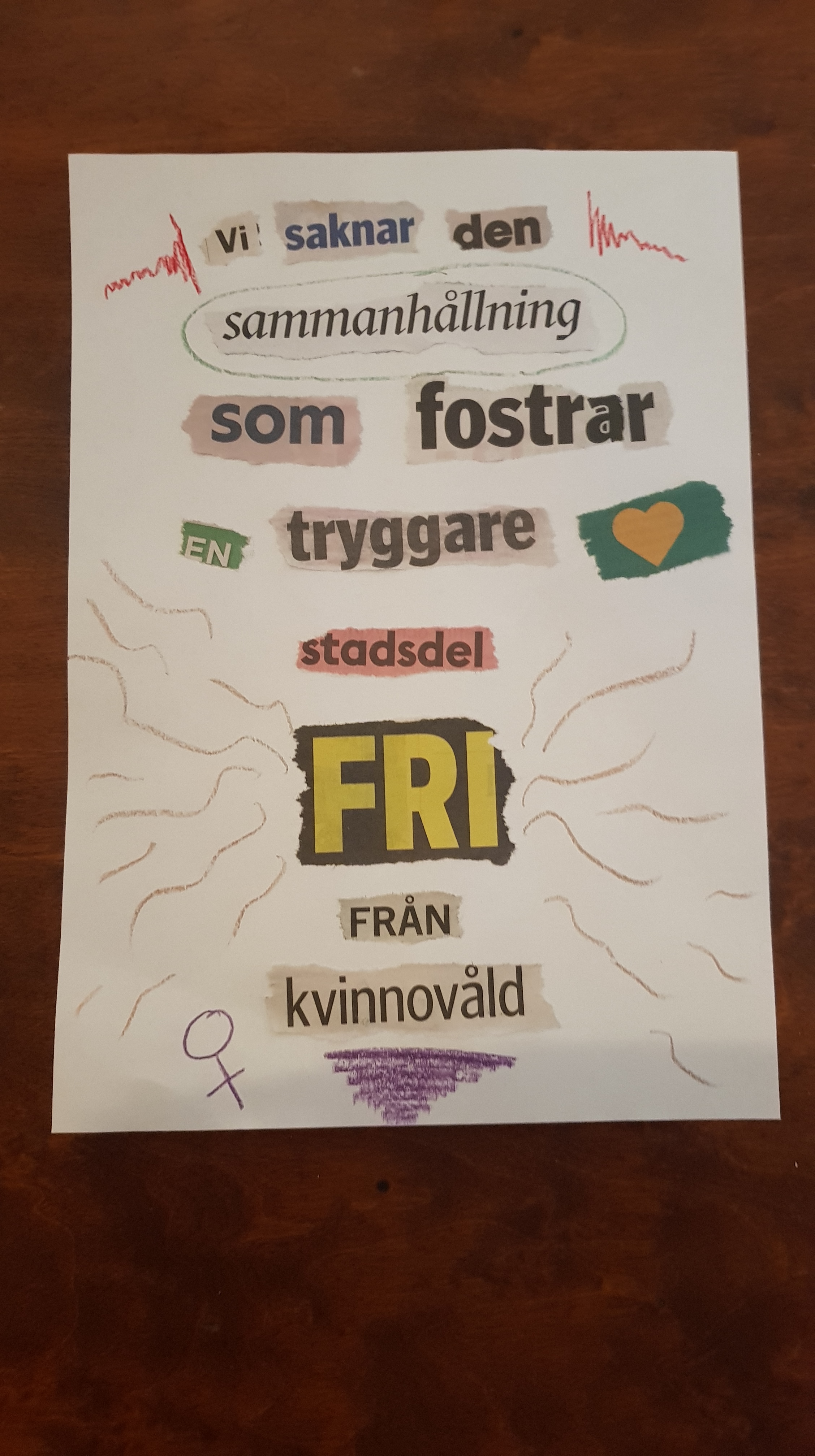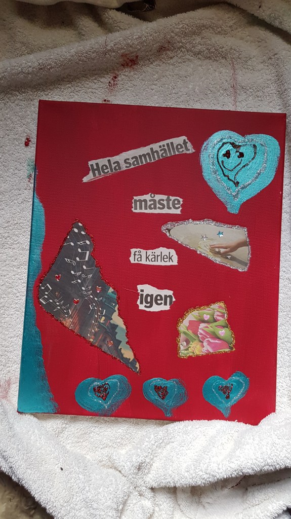 About a year ago I started making collages out of words from newspapers, which turn into a sentence. I don’t follow a plan, I make them very quick and then I paint, which I’m terrible at. But nevertheless I do it, using all from acrylic paint to crayons, marker pens and loads of glitter glue.